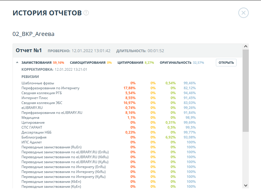 Оценка оригинальности в строке документа предназначена для первичного, поверхностного ознакомления с результатами проверки. Для получения детальной оценки о результатах проверки перейдите к просмотру результатов проверки, нажав на кнопку «Просмотреть результаты». После чего выберите «Полный отчет».
