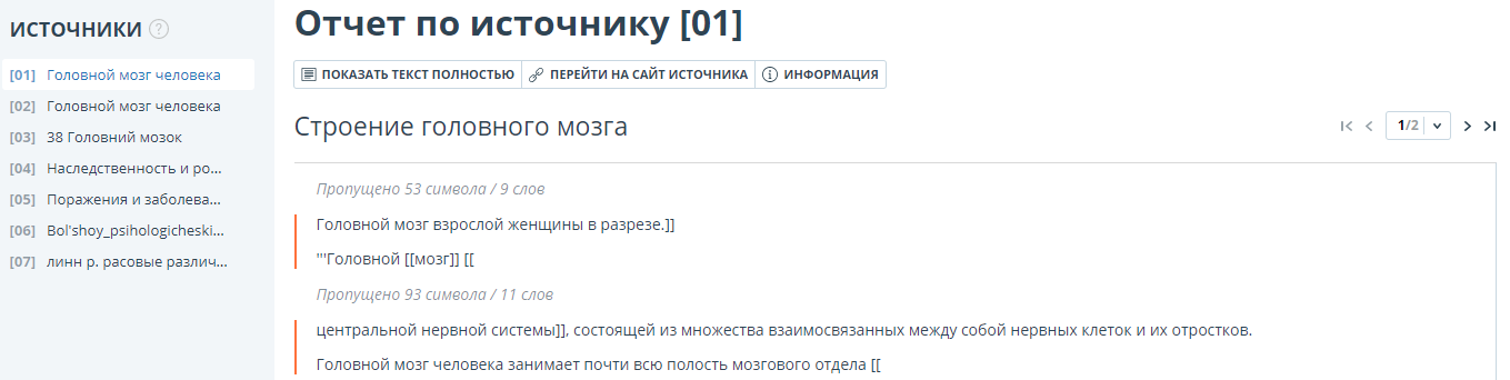 Вы можете выбрать режим просмотра отчета по источнику – постранично или сплошным текстом. По умолчанию отчет по источнику отображается постранично. Чтобы переключить режим просмотра, нажмите на «Показать текст полностью». При переходе в режим просмотра сплошным текстом кнопка изменится на «Показать текст постранично». Нажмите ее, чтобы перейти в режим постраничного просмотра.