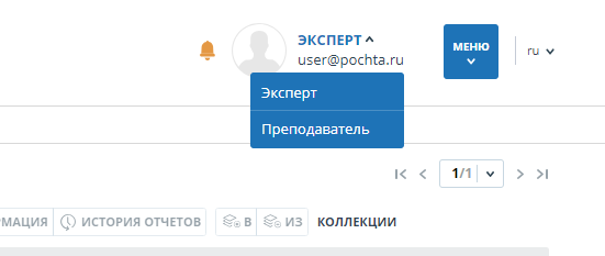 После авторизации на любой странице сайта в правом верхнем углу страницы отображается иконка «Меню». При нажатии на иконку доступна навигация по разделам вашего аккаунта. Слева от иконки «Меню» вы увидите краткую информацию о себе: роль в системе и e-mail. На рисунке приведен пример для роли «Эксперт».